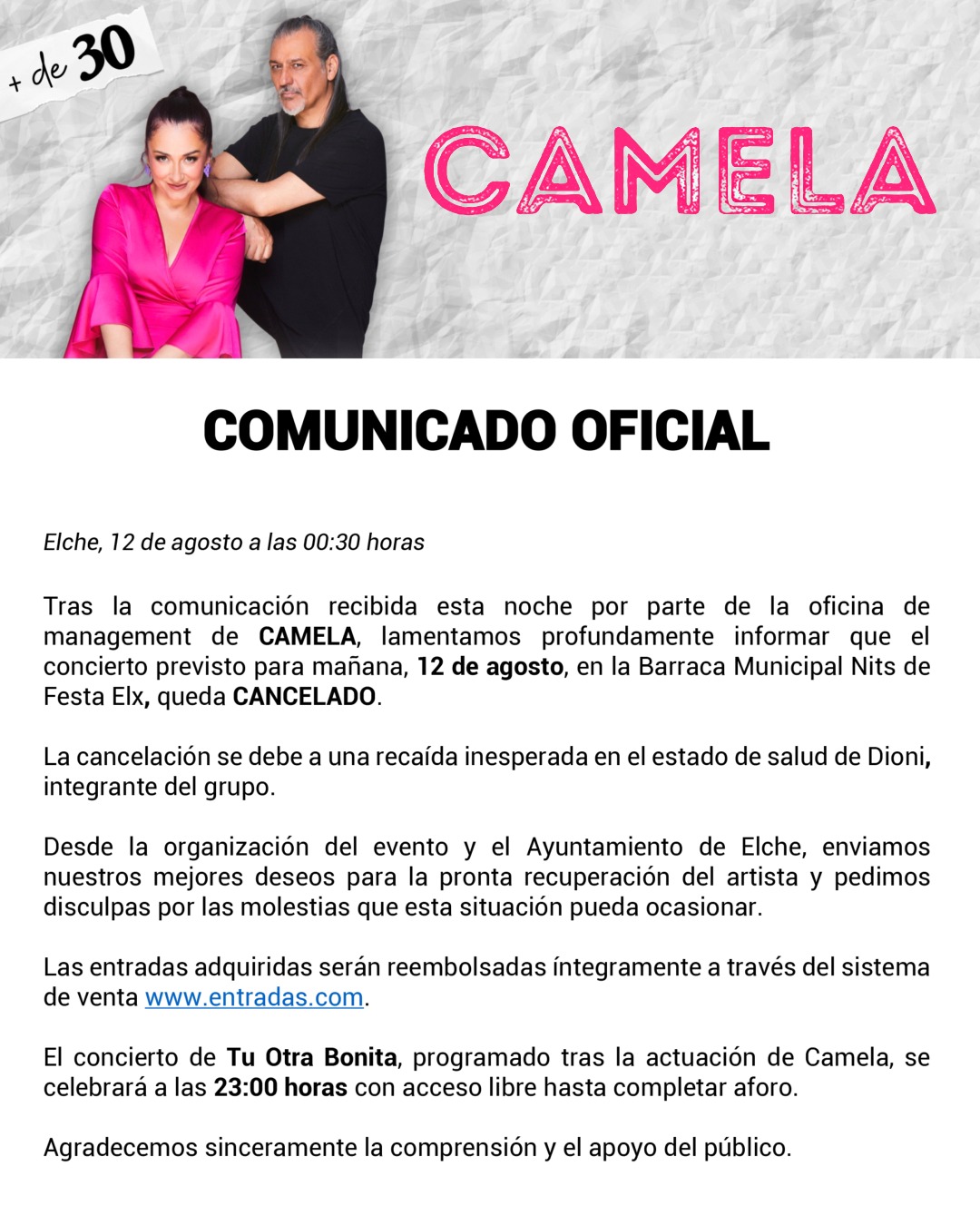 CANCELADO—–CAMELA “+ DE 30 AÑOS”